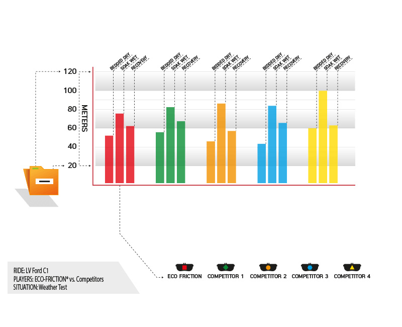 Consistency is key. To keep control, and to be one step ahead of whatever’s in front of you. Test results show that ECO-FRICTION® Brake Pads not only provide powerful stopping power, their performance remained stable throughout all situations, from varying speed settings to extreme temperatures.